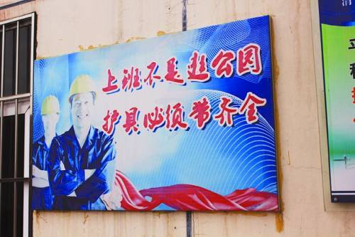 笔者粗略统计了一下,计量站内,地面上总共印有33块安全口号,墙上贴有4块安全标语,所有仪器上共贴有6块操作标准,9个指标牌。仔细观察还会发现,大门两侧用红色油漆写的一行“在岗一分钟,安全六十秒”的口号已经难以识别。