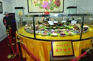 赏奇石,观阿玛尼亲笔手稿,看艺术大师作品,市民可在宋庄艺博会展区内的四大板块展览中免费参观。图为奇石展中,一百一十多道菜的满汉全席全部是由石头组成。本报特约摄影 常鸣摄