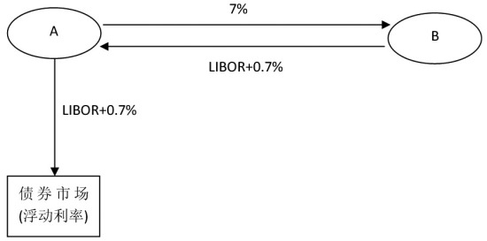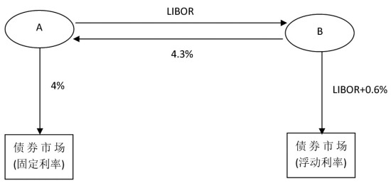 注意到A和B的利率报价中有一个特点,即固定利率直接的差价大于浮动利率中间的差价。B在固定利率市场中比A多付1.2%,而在浮动利率的市场中只需多付0.5%,因此B在浮动利率的市场中存在比较优势,A在固定市场中存在比较优势。因此,它们两者可以在自己具有比较优势的市场借入资金,并直接与对方进行下图中的互换。