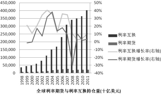 从持仓量而言,全球利率互换名义本金持仓量从1999年的44万亿上升到2008年的341万亿,增长率超过了670%,而同时期的利率期货增长率仅为130%。