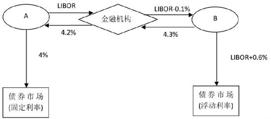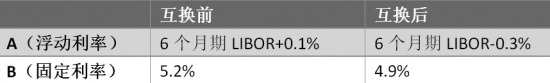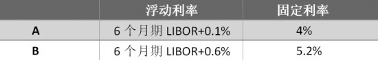 首先必须看到,A和B在浮动利率市场得到的LIBOR+0.1%及LIBOR+0.6%的利率为6个月期的利率。在浮动市场,资金的借出方通常有机会每6个月检查一次利率,当资金借入方信用评级降低时,资金借出方可以选择在LIBOR利率上加息以补偿增大的违约风险。而在固定利率市场,固定利率的资金借出方无法改变贷款的条款,因此固定利率债券合约利率稳定期比浮动利率合约更长。