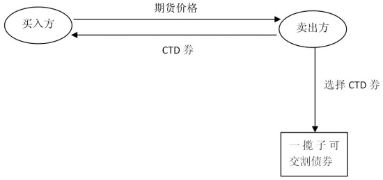 国债期货多数采用现券交割制度,基本流程如下图所示:买入方在交割日或交割期内向卖出方支付等于期货价格的现金,而卖出方在一揽子可交割债券中选择(买入或先前拥有)最便宜交割债券(Cheapest-To-Delivery,CTD券),把券交付给买入方。