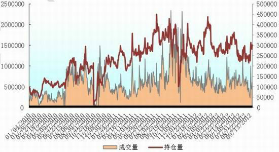 在QE3推出之前,价格呈现缩量上行态势,成交量萎缩明显,最低时日成交量仅23万余手,之后伴随价格快速上涨,成交量骤然放量,最高时日成交量为100.46万手。持仓量方面也基本呈现同步变化,但前期持仓量并未出现明显缩减,基本保持在24万手左右,随着价格快速拉升,持仓放量,目前保持在30万手左右。