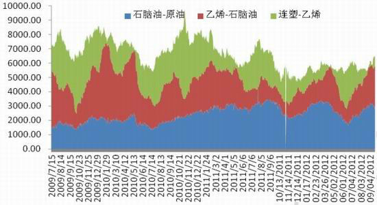 图2-2:乙烯、石脑油与LLDPE期货价格价差走势对比图