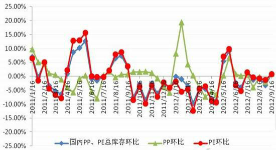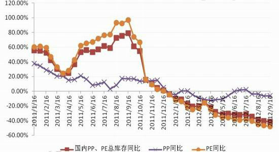 截至2012年9月16日,国内PP、PE主要市场总库存上涨,较上月底增加0.83%,与上年同期比减少41.7%。库存结构上看,本月PP和PE库存上升。其中,PP较上月底增加0.94%,比上年同期减少6.09%;PE较上月底增加0.80%,比上年同期减少47.92%。从区域来看,本月南北方库存均上涨。北方库存较上月底增加1.35%,比上年同期减少49.00%;南方库存较上月底增加0.59%,比上年同期减少37.44%。总体来看,9月份上半月主要市场库存情况呈止跌上涨的过程。