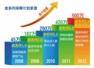 金系列保障计划是太平洋保险在2008年引入国际领先精算技术开发出的一款包括寿险保障和重大疾病保障,并且保额可逐年递增的产品,得到了广大客户的认同。五年来已有500多万个客户选择了该产品,相当于每30秒就有一个客户投保;数百万个家庭的寿险和重大疾病保障得到了有效提升,保额累计达数千亿元。