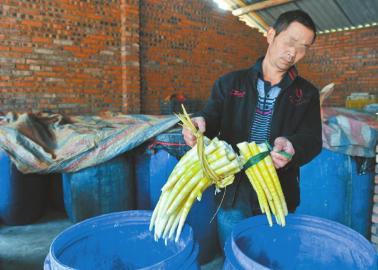 昨日中午,李强带记者来到了位于怀远镇黄鹤村的一家农户。红砖瓦房的大院子门虚掩着。透过门缝看到,两名男子正搬弄着蓝色大型塑料桶,另一名男子将捆绑好的竹笋往桶里放,用黑色塑料封存泡制。蓝色桶整齐堆放在角落里,看到陌生人在院子外,男子要求记者离开。