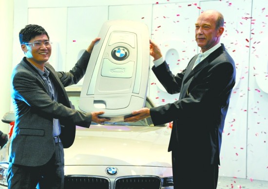 宝马汽车在中国市场上的第100万个用户、从事律师工作的吴洪波从宝马集团大中华区总裁兼首席执行官史登科博士手中接过一辆BMW320Li的车钥匙。
