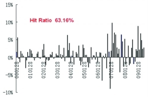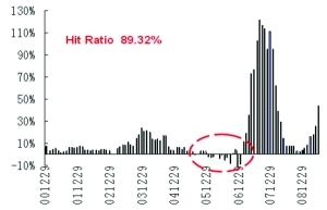 Alpha策略成功的关键就是寻找到一个超越基准(具有股指期货等做空工具的基准)的策略。比如,可以构造指数增强组合+沪深300指数期货空 头策略。这种策略隐含的投资逻辑是择时比较困难,不想承受市场风险。图1和图2是根据我们一个定量增强策略对冲系统性风险之后的月度Alpha收益和滚动 年Alpha收益。通过对冲策略,我们的组合在63.16%的月份获得正收益,而从年滚动收益来看,获取正回报的概率是89.32%。从收益来 看,2000年以来平均每个月高达0.98%,2006年以来月收益达2.18%,而2000年以来滚动年收益平均为16.05%,2006年以来滚动年 收益平均为36.73%。其中获取负收益的时间主要集中在2005-2006年股改期间,定量策略失效,未能成功战胜沪深300。在国内基金运行的这几年 中,基金表现出卓越的选股能力,通过Alpha策略可以成功地放大基金公司这方面的专业技能。