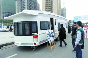 在展场上,吸引人们眼球的还有3艘德国制造的拖挂式房车,价格分为28.8万、38.8万和42.8万元。其中一辆名叫“元贞”的房车有厨房、卧室、卫生间、冰箱、暖风机,该房车可同时吃住4人。另外一辆叫“芬特”房车更象房,售价只有28.8万元。室内达18平方米,该房车不仅有房檐,四周有360度窗户,需要3.0以上排量汽车来拖。