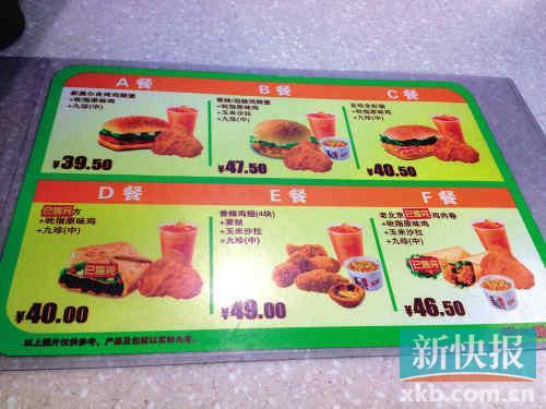 此外,记者发现,这些连锁餐饮企业在机场店并非照搬市内的套餐,使消费者无法简单比对价格差异。如肯德基机场店,其套餐分类,都是在广州市区见不到的:A餐是新奥尔良烤鸡腿堡+吮指原味鸡+九珍(中)是39.5元,E餐是香辣鸡翅(4块)+蛋挞+玉米沙拉+九珍(中)是49元。
