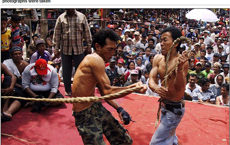 这种仪式名为ujungan,印尼许多地区都有类似传统,包括谏义里(Kediri)。村民们将棕榈叶的筋捻到一起做成绳子,在证明人和兴奋民众见证下,互相鞭笞5下,但不能抽打腹部以下和脖颈部分。