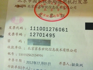 市民鲁小姐在京东网上商城买了一个iPhone手机发票。北京晚报配图本报讯(记者李嘉瑞)市民鲁小姐在京东网上商城买了一个iPhone手机,却多次花屏。经过苹果专卖店鉴定后,鲁小姐意外发现,这个iPhone很可能不是新品,而是返修货。目前,鲁小姐要求直接更换新机。但京东商城希望能检测后,再判断是修理或是更换。