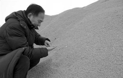 宋新华在谷堆前查看今年新收的稻谷