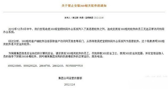 微博附有一份名为《关于禁止安装360相关软件的通知》的文件截图,该通知全文如下:“2012年12月6日中午,我们发现奇虎360将宝钢协同办公系统列入了其恶意软件之列,造成安装有360相关软件的员工无法正常访问协同办公系统。经过分析,360相关客户端软件设有获取客户访问网页信息等后门,从而导致误把宝钢协同办公系统列为恶意软件。这个现象表明360相关软件是不安全的软件。为保障集团信息安全和您的计算机安全,请装有360相关软件的员工,尽快卸载360安全卫士,禁用360安全浏览器,并在宝信运维人员的指导下卸载360杀毒软件,同时确保集团采购的防病毒软件的正常运行。”来源为“宝钢集团”,落款人是“集团公司运营改革部”。