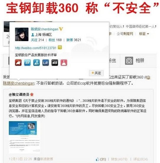 网友“独立调查员”12月13日发布微博,称宝钢集团认为360相关软件不安全的软件。为保障集团信息安全和员工的计算机安全,请安装有360相关软件的员工,尽快卸载360安全卫士,禁用360安全浏览器。并在宝信运维人员的指导下卸载360杀毒软件,同时确保集团采购的防病毒软件的正常运行。