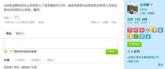 此微博引来不少网友的转发和评论。多名宝钢集团的内部工作人员亦在网上证实此事。微博认证为“宝钢工程技术集团有限公司工程设计院主任设计师”的网友“金亚飚”称:“360将宝钢协同办公系统列入了其恶意软件之列,造成安装有360相关软件的员工无法正常访问协同办公系统。晕呀。”