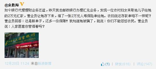 中国经济网北京12月21日讯 如今银行代理理财业务泛滥,资深传媒人余胜海日前在其微博里称,他在邮储银行办理汇兑业务的时候,亲眼目睹了银行营业员忽悠一位农村妇女存款变保单的一幕。当余胜海看出事件真相跟该营业员说你们不能忽悠农民的时候,该营业员竟然说到“人家愿意你管得着吗?”。网友随即表态,这位营业员的做法实在有点过了,这样是败坏行业口碑,应该建立黑名单。