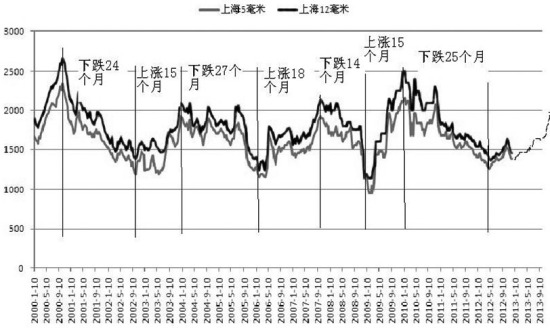 从2000年以来上海地区白玻价格看,第一个高点为2000年10月的2300元/吨,此后价格一路下跌,最低到达2002年10月的1200元/吨,历时24个月。从2002年10月最低点算起,至2004年1月价格最高达到1900元/吨,历时15个月。第二个高点从2004年1月算起,至2006年4月达到最低点1150元/吨,历时27个月。再以此最低点算起,至2007年10月价格再次达到最高1900元/吨,历时18个月。第三个高点从2007年10月算起,至2008年12月价格达到最低点930元/吨,历时14个月。这波下跌过程主要受到金融危机的影响,跌得快而急,以至于下跌时间偏离了正常下跌周期范围。之后从2008年12月最低点起,至2010年3月价格达到最高的2120元/吨,历时15个月。第四个高点从2010年3月算起,至2012年4月价格达到最低点的1280元/吨,历时25个月。