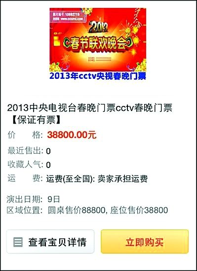 本报讯(记者赵宇)日前,一些购物网站上的商家开始预售今年春晚门票,价格分别为座位38800和圆桌88800的天价。前日,2013央视春节联欢晚会官方微博发布声明辟谣,称“从未以任何方式、通过任何渠道销售春晚门票”。
