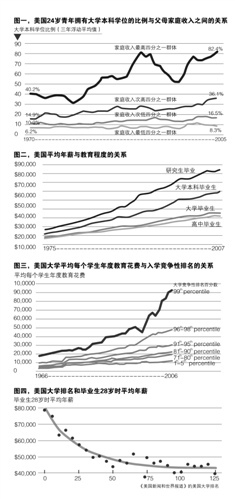 经济学家和社会学家纷纷指出美国贫富两极分化和社会阶级世袭固化的共同原因——教育机会和水平的两极分化。这一两极分化现象,在高等教育领域表现得最为淋漓尽致。图一是《纽约时报》去年一篇有关分析列出的大学本科比例与父母家庭收入之间的历史关系曲线。到了2009年,在最富四分之一美国家庭的子女中,24岁时具有大学学位的占82%,在最穷四分之一的家庭里,这一比例只有8%,相差整整十倍!