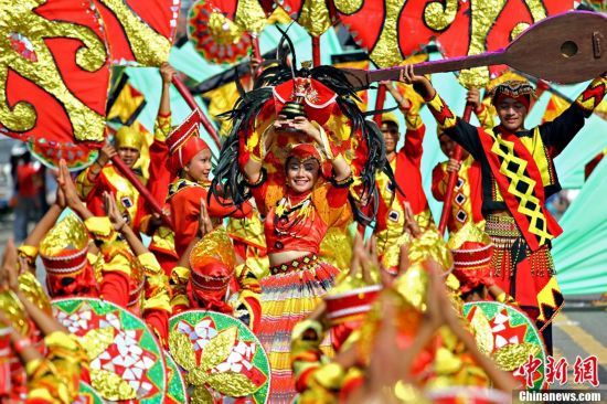 1月20日,菲律宾南部棉兰老岛上的武端市民众盛装上街,载歌载舞,欢庆当地传统节日“Kahimunan”节,“Kahimunan”在当地方言中意为“聚会”。中新社发 马斯卡里纳斯 摄