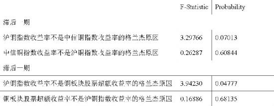 表2 沪铜指数收益率与中信铜指数收益率、铜板块股票超额收益率格兰杰因果关系检验