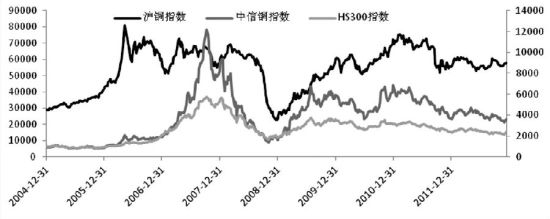 为了研究沪铜期货与我国A股市场铜板块之间的联动效应,我们选择沪铜指数作为国内铜期货价格,相关板块方面选择中信三级分类指标中的铜指数,为比对铜板块股票相对股市超额收益率选择沪深300指数作为基准,数据频率为周度数据,时间区间为2004年12月31日至2012年12月14日,所有数据来源于wind资讯。记中信铜指数、沪铜指数以及沪深300指数收益率分别为Rt、Rf和Rm,收益率取对数收益率其计算公式为R=LN(当期值/上期值)。