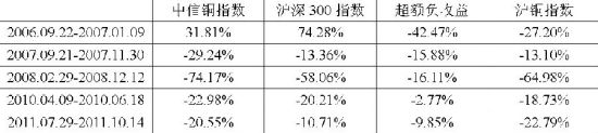 为了验证上述结果,我们截取铜处于上涨或下跌周期时间段内铜板块股票与沪深300指数走势并进行对比分析。由于股市波动较期市频繁,我们重点考虑较短时间内铜价大幅上涨或下跌时,对应铜板块股票收益率的表现情况。结果显示,当铜期货价格大幅上涨时,铜板块股票也大幅攀升,其涨幅一般高于沪铜指数,且相对沪深300指数有明显的正超额收益,而当铜期货大幅下跌时,对应铜板块股票则具有一定的负超额收益。当然,短期内影响股市的因素更多且更加敏感,两个市场不会完全同步,因此两者只是大部分时间内趋势一致而不会完全同步,如2006年9月22日至2007年1月9日,沪铜指数下跌了27.2%,但同期由于A股走势强劲,沪深300指数大幅上涨74.28%,同期中信铜指数亦上涨了31.81%,从而走出一波与期价相反的行情。
