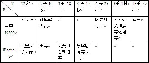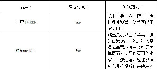 1.水杯泼水测试,满满一杯热水彻底泼在了三星I9300上,用纸擦干之后,无论是屏幕还是通讯录每个菜单,一点问题也没有出现,iPhone4S也是一样,虽然这两款手机没有防水功能但看起来密封程度还是很好。