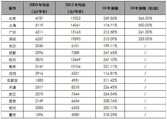 附表:全国15个重点城市房价10年涨幅