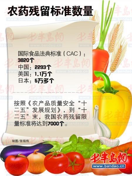 同时该负责人表示,与国际食品法典标准(CAC)、美国和日本等国家相比,我国农药残留标准还有一定差距。目前CAC有3820个,美国有1.1万个,日本肯定列表有5万多个。按照农业部制定的《农产品质量安全“十二五”发展规划》,到“十二五”末,我国农药残留限量标准将达到7000个。据《人民日报》