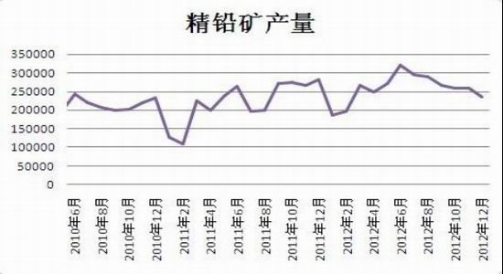 中国有色金属工业协会数据显示,2012年12月铅精矿23.41万吨金属量,较11月的25.76万吨环比下降9.14%,为去年3月以来的最低值。2012年累计产铅精矿283.84万吨金属量,累计同比增20.36%。除了气候偏冷导致停工的因素外,原生铅冶炼企业资金压力凸显也是环比下降的一个关键因素。12月为传统的银行还贷期限,企业银根普遍收紧,原生铅冶炼企业资金流转压力凸显,其中上市公司更因为编制企业年报而需要保证流动资金,故减少对原材料铅精矿的采购。