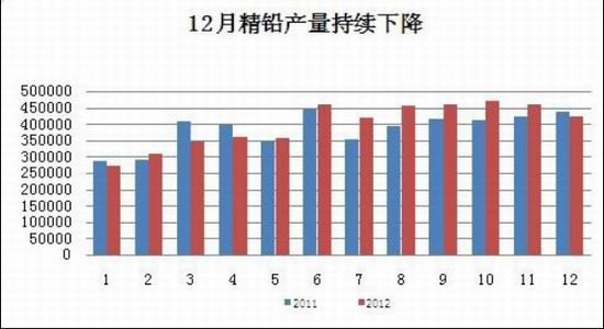 根据国家统计最新公布的数据,中国2012年12月我国精炼铅产量42.3 万吨,同比下降3.6%,环比下降7.6%。2012年全年累计精炼铅产量480.20万吨,同比增长4.3%。12月份精铅产量下降的一个重要原因是铅精矿供应不足,而进口铅精矿较贵,加之铅生产本身利润有限,因此导致铅锭产量下滑。加之铅蓄电池行业处于整顿阶段,停工停产导致采购减小。不过,随着节后复工陆续到来,加之下游产业的恢复性增长,预计1-2月铅锭订单会有一定恢复。