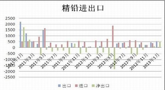 海关数据显示,1月份中国精铅进口30吨,同比锐减46.42%;精炼铅出口528吨,同比增加1537%。不过,进出口数据的大幅度变动是铅价长时期内弱外强的自然反映,更多的是反映了市场现实,以现在的出口量不足以改善国内铅价环境。