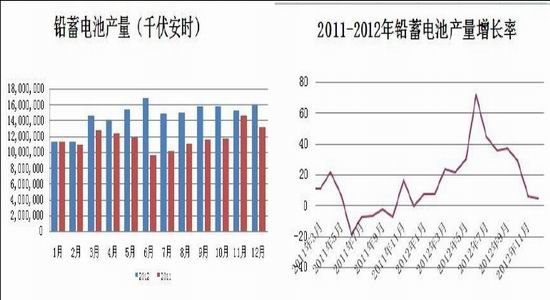 据相关数据显示,2012年12月份铅蓄电池产量止跌回升,当月产量为1594.91KVAH,环比小幅上升4.49%,产量创下全年第二高位。2012年全年产量为1.75亿KVAH,相较于2011年的1.4亿KVAH同比大增27.35%。