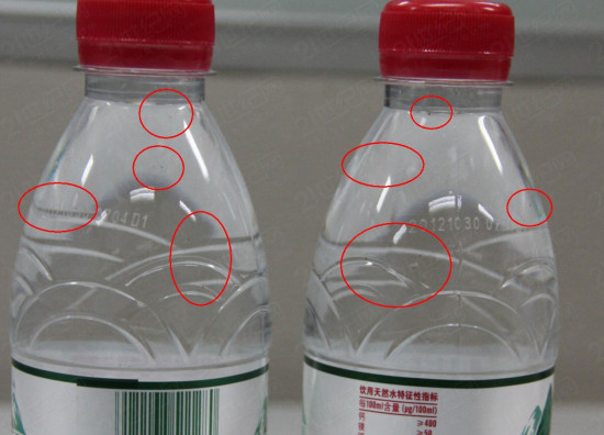 而通过21世纪网的查验,一箱水中共有13瓶能非常明显看到瓶中悬浮的黑色不明物,且有的附着在瓶身内壁。明显看到黑色悬浮不明物的13瓶水中,有11瓶印有“201210300704D1”的字样,另外有2瓶印有“201210300315D1”的字样。