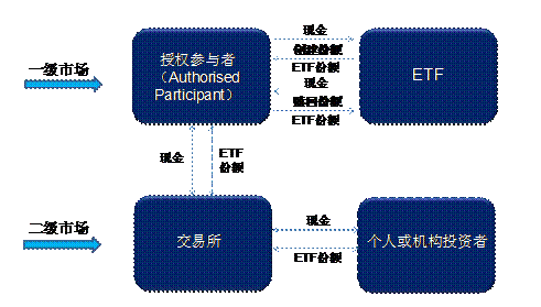 在获得ETF份额之后,授权参与者再在二级市场上(交易所)将份额零售给一般投资者。授权参与者担负着平抑ETF折溢价的作用。由于授权参与者与ETF进行份额创建和赎回时按照的价格是基金单位资产净值,因此当二级市场上ETF的价格超过ETF的实际单位资产净值时,授权参与者可以立即以单位资产净值为成本创建新的份额,在二级市场上卖出。供给增加后ETF二级市场价格下降至单位资产净值,授权参与者获得无风险套利收入。反之也是一样,当二级市场ETF价格低于ETF的实际单位资产净值时,授权投资者在二级市场上买入份额然后在一级市场上赎回套利。