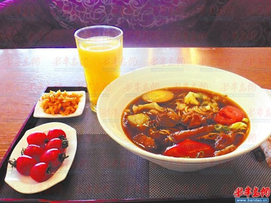 喝羊汤品红酒:青岛机场中图咖啡厅,一碗汤面,也就康师傅碗面那么大的量,里面飘着几粒牛肉粒,外带三个小柿子,四片辣白菜,67元,真黑!这是我吃过的最贵的汤面!