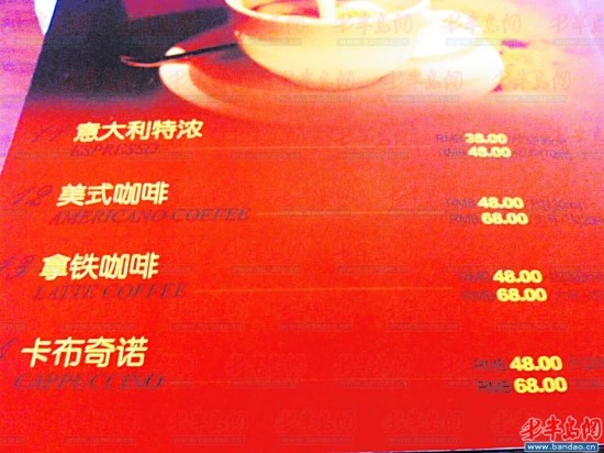无独有偶,几乎所有的咖啡店里销售的可乐、牛奶、雪碧等都售价30元,而这已经是咖啡店里最低价的饮品。咖啡价格都在38元到98元不等,其中一家咖啡店的蓝山咖啡售价最高达到了一杯138元。
