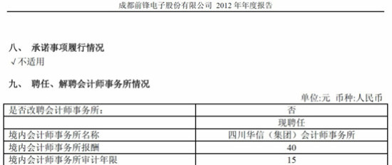 S*ST前锋2012年年报显示,其境内会计师事务所报酬仅为40元人民币,而其他上市公司会计师事务所报酬都是以万元计算的,如贵州茅台聘任的境内会计师事务所报酬为80万元人民币。