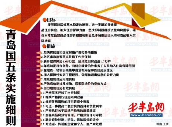 本报3月31日讯(记者 王爱科) 岛城“国五条”实施细则正式出台。31日下午,青岛市人民政府办公厅发布“关于继续做好房地产市场调控工作持续推进房地产市场平稳健康发展的意见”。从制定新建商品住房价格控制目标,加快保障性安居工程规划、建设和供应,增加普通商品住房用地和有效供应,坚决抑制投机投资性购房以及加强房地产市场监管规范市场秩序等五方面,保证房地产市场平稳发展。