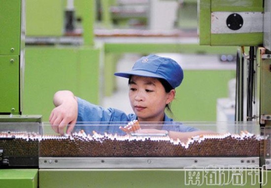 江苏中烟工业公司,工人在生产线上抽检成品卷烟质量。“卷烟降焦减害”研究是否能达到减害目的,一直是谢剑平能否当选工程院院士的争议焦点。