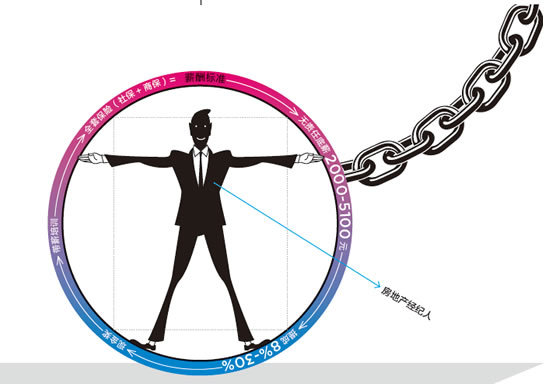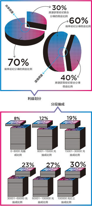 在一个月内,如一名经纪完成多宗交易,“业绩”会累加,根据累进的抽成比例进行提成,8%—30%不等,由于房价猛涨,标准已数度调整,目前的标准是:8000元以下,抽成8%;8001-15000元,抽成12%;15001-30000元,19%;30001-60000元,23%;60001-100000元,27%;100001元以上,30%封顶。店长在全单佣金上提取5%作为业绩,抽成一样实行累进制。