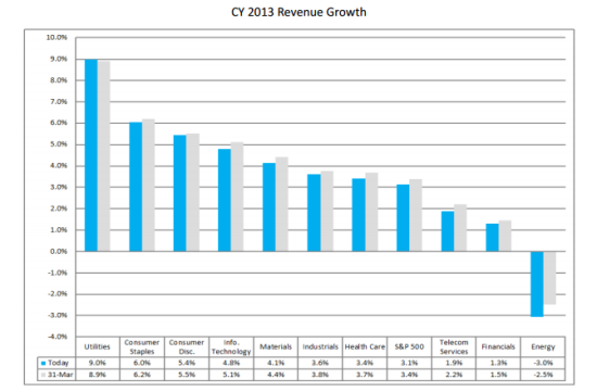 根据Factset于2013/4/12发布的最新研究报告:各行业2013财年营收增长和利润增长情况分别见下图四:前期股价表现较好的公用事业板块尽管营收增长排名各行业之首,但是利润将现负增长。