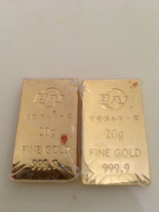 两年前,邵女士在北京通州蓝岛大厦的菜百首饰店,先后共购买了20克999.9收藏金条两块,两块黄金的购买时间相差两个多月。今年3月,邵女士在查看金条时着实吃惊不小:金条上出现了铁锈一样的红褐色斑点。无独有偶,梁女士于2011年8月份在菜百首饰购买了100g999.9金条一块,金条上出现了与此前被曝光金条一样的红色斑点。