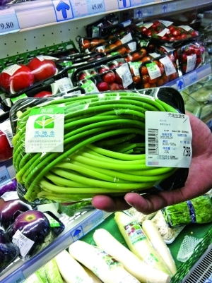 在一家大型超市内,工作人员正在精心包装蔬菜,并在外包装上贴上了两个标签,一个是绿色半圆形并印有“某某有机绿色食品公司”的标签,还有一个是该种蔬菜的价格签。一对年轻夫妇走过去拿起来看了看,问销售人员,“这是有机蔬菜吧?”听到肯定的回答后,两人把菜放进选购篮中。