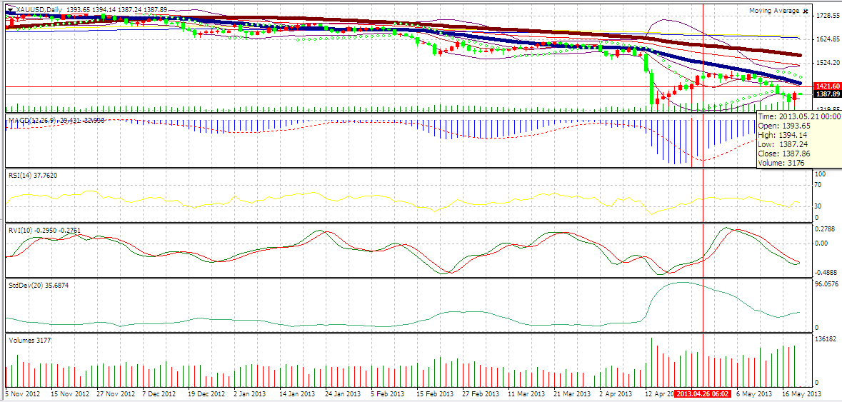 2013.5月21日 关注美国股市,关注黄金1350一线支撑情况,白银关注22支撑力。2013年5月21日Tuesday中线多单最高1399目标已经到了。
