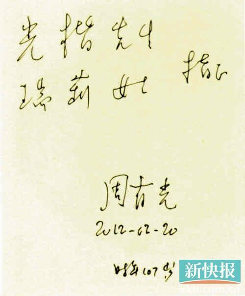 我们拿出《周有光百岁口述》和《静思录》,请老人签名。“我的手有点抖了,写不好。”但他写下的字,笔迹依然清晰工整。签名后,周有光从抽屉里拿出一个小时钟,看了一下日期,认真仔细地署上“2012-02-20”。“2”的月份前还加上一个“0”,可看出老人严谨的工作习惯,虽然高寿,但思维依然缜密。他还写下“时年107岁”。