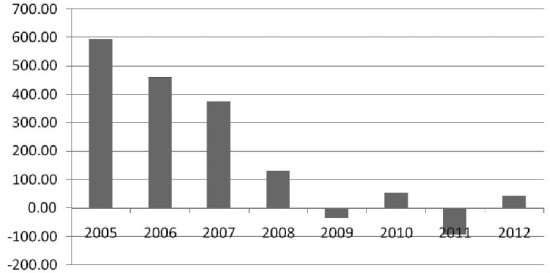 图2显示,2005年—2012年,螺纹钢与热轧的年度价差波动剧烈。2005年—2008年,两者的年度价差日趋缩小,由2005年的近600元/吨下降至2008年的133元/吨。进入2009年,两者价差进入负时代,且呈现小幅波动,平均年度价差均在正负100元/吨的范围内,甚至低于成本价差范围。年度价差呈现如此大的变化主要是因为两者供需格局的变化。